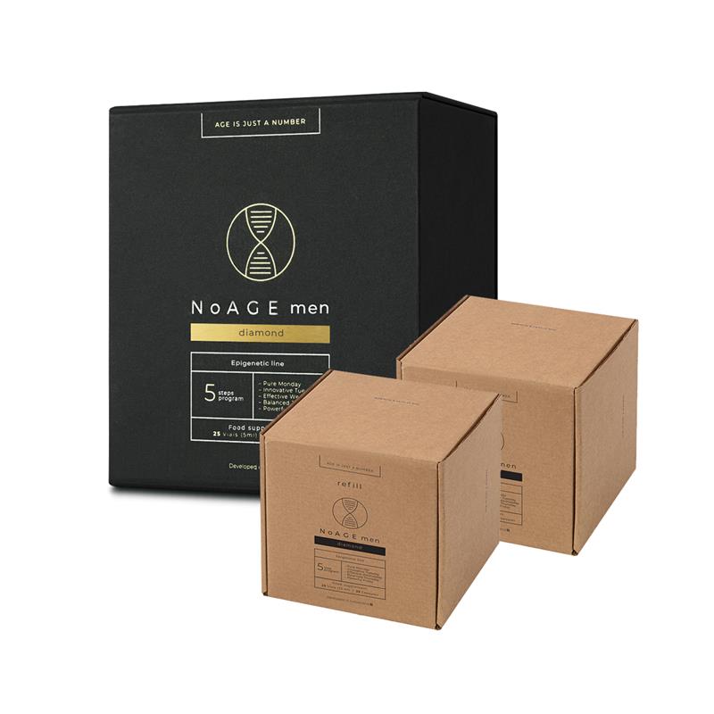NoAGE – a complex of 5 product pairs (capsule & vial) in one box. Using them together, each pair fight a different process that causes ageing.